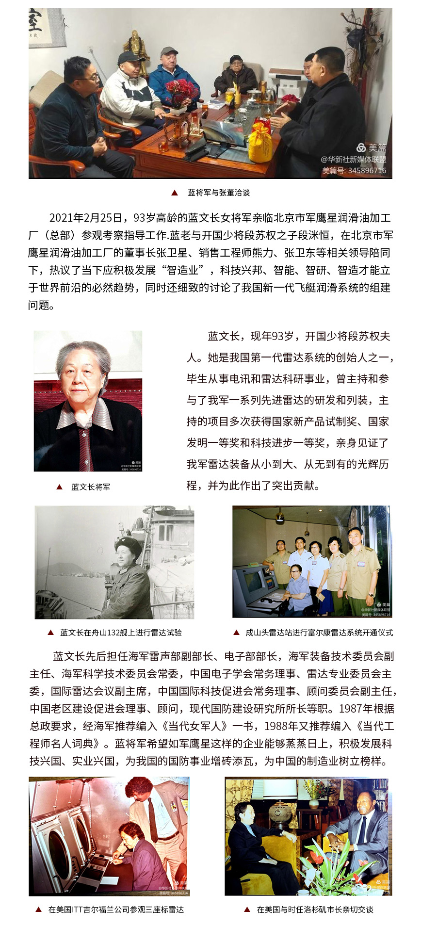 新中国开国少将段苏权夫人蓝文长到军鹰星参观考察指导工作
